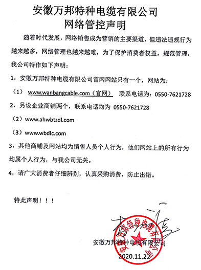 鄭重聲明:安徽萬邦特種電纜有限公司官方網站為:www_wanbangcable_com.3f6uf.cn,除此之外無任何子網站或合作網站,其余均為假冒偽劣。電話:0550-7621728 13485756353 地 址:安徽省天長市滁州高新技術產業開發區經四路29號